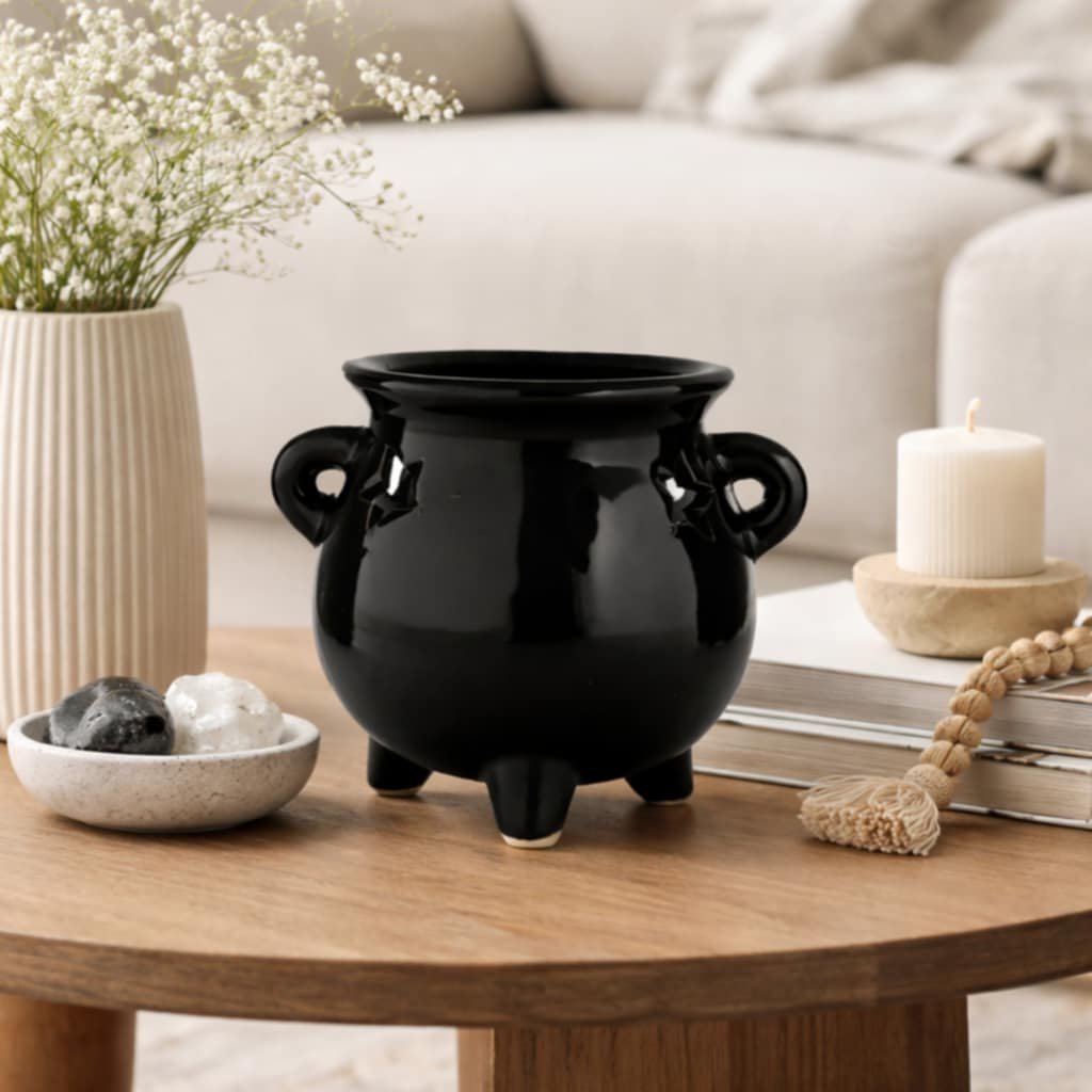 Černá aromalampa ve tvaru kotlíku s vyříznutými detaily přímo z noční oblohy na Vás okamžitě přenese svou kouzelnou hvězdnou atmosféru. Aromalampa je vhodná pro vonné oleje i vosky a díky svému vzhledu se stane ozdobou nejednoho magického koutku. Stačí jen přidat pár kapek oblíbeného oleje do horní misky a během okamžiku se vaše místnost naplní příjemnou vůní, která bude mít blahodárné účinky na vaši náladu a pohodu.