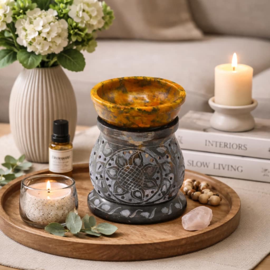 Aromalampa vyrobená z mastku s motivem mandaly spojuje tradiční materiál (mastek) s uměleckým vzorem mandaly.