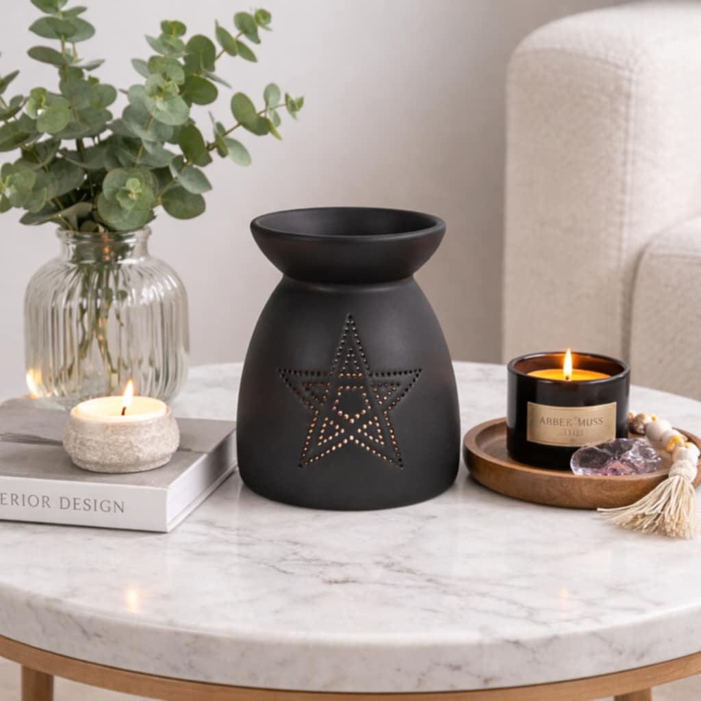 Stylová a elegantní aromalampa z černé keramiky s precizně vyřezávaným motivem pentagramu. Tento symbol ochrany a harmonie a rovnováhy dodává lampě mystický nádech .Aromalampa se stane nejen funkčním pomocníkem pro provonění vašeho domova ,ale také jedinečným dekorativním prvkem. Ideální pro použití s vonnými oleji či vosky. Perfektní dárek pro milovníky vůní a stylových doplňků