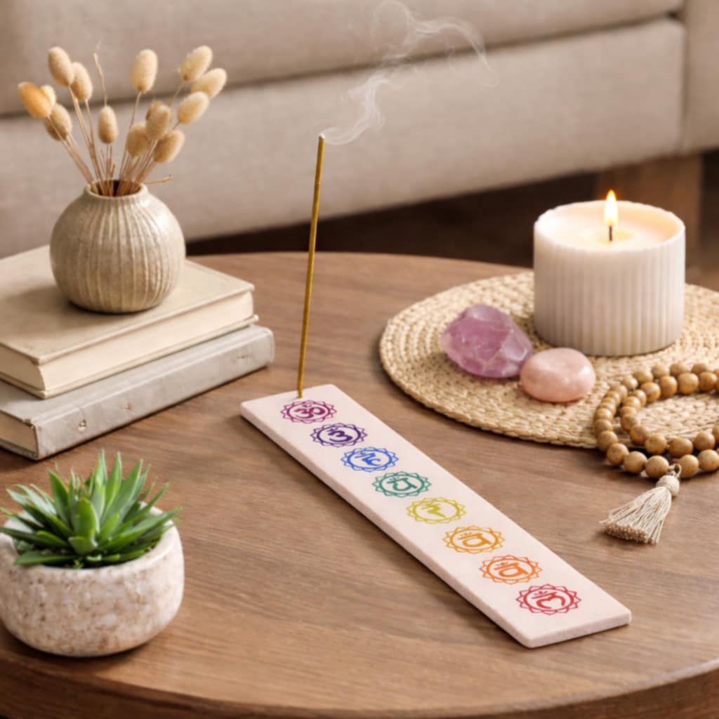 Čakrový stojánek na vonné tyčinky s potiskem čaker. Společně s vonnými tyčinkami vytvoří nádhernou relaxační a harmonizační atmosféru vůní.