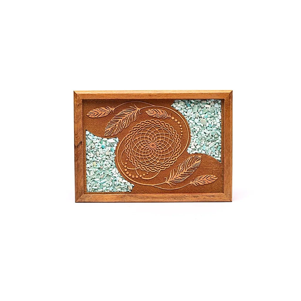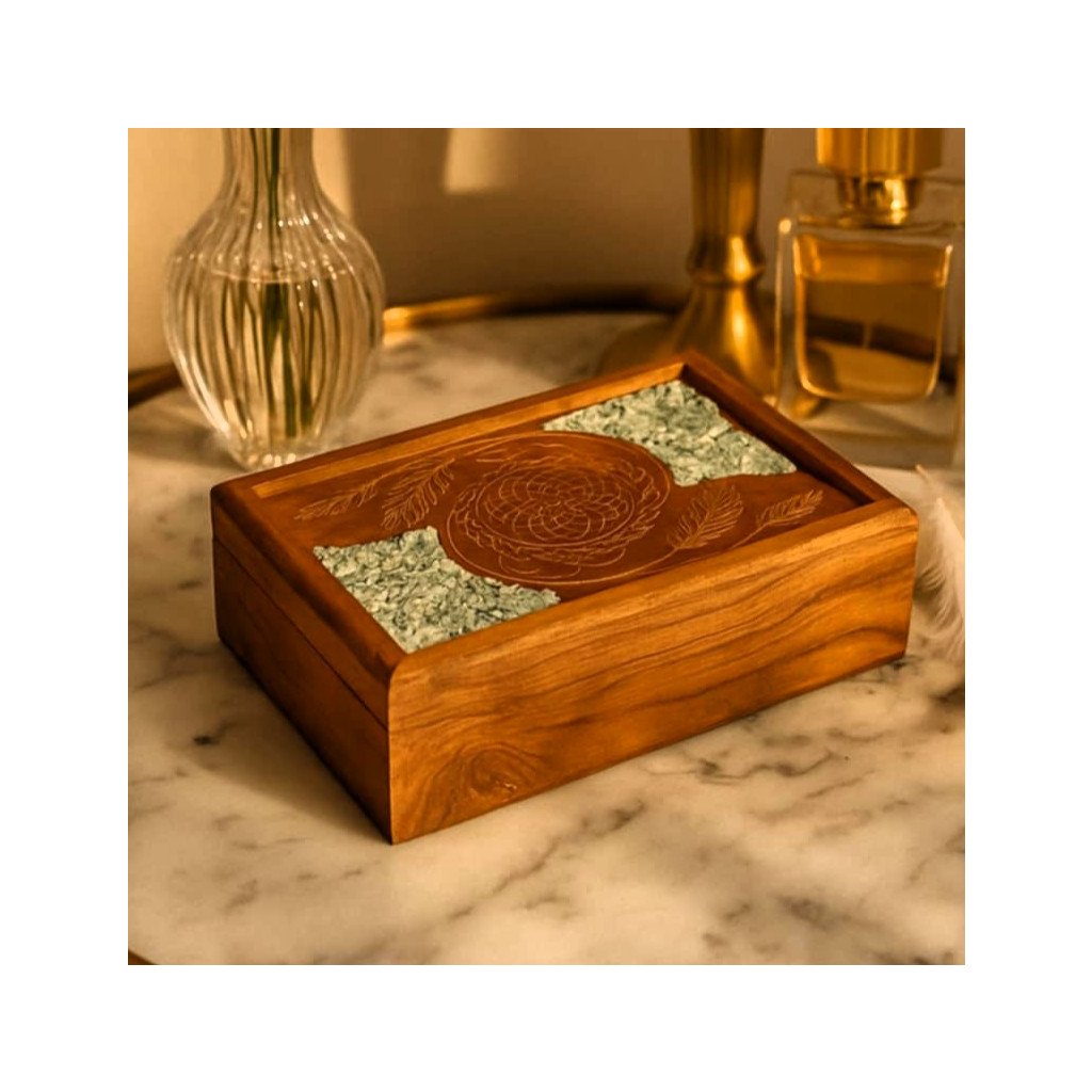 Luxusní, ručně vyrobená úložná krabička z mangového dřeva s rytým motivem lapače snů a jemnou intarzií z amazonitu – minerálu spojeného s klidem, pravdou a rovnováhou emocí. 💫