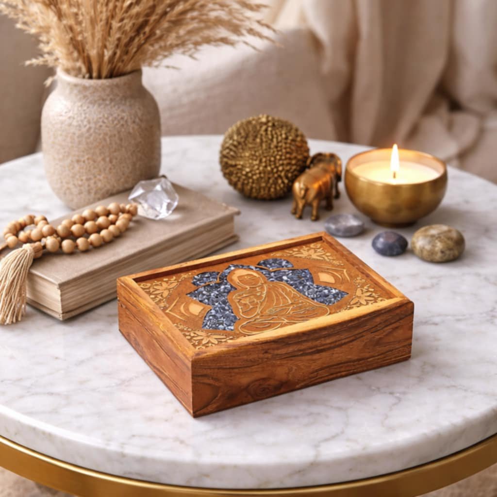 Luxusní ručně vyrobená úložná krabička z mangového dřeva s rytým obrazem Buddhy a intarzií ze sodalitu - minerálem spojeným s klidem, intuicí a mentální rovnováhou Elegantní a výjimečný doplněk pro bezpečné uložení tarotových karet, šperků nebo jiných významných předmětů i jako reprezentativní dárek.