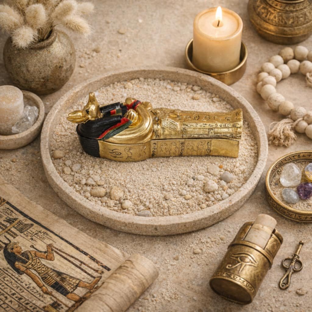 Soška egyptská schránka Sarkofág Anubis, který v záhrobí vítal zesnulé a při soudu mrtvých vážil srdce zesnulých s perem pravdy, které obsahovalo všechny hříchy, již zesnulý za svého života spáchal. Je vyrobena z kvalitní pryskyřice, což jí dodává pevnost a odolnost Její velikost ji činí dostatečně výraznou, aby přitahovala pozornost, ale zároveň dostatečně kompaktní, aby se vešla do každého interiéru