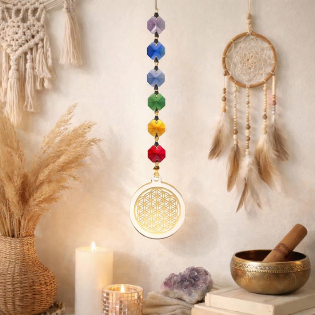Objevte harmonii a krásu s Feng shui čakrovým lapačem sluneční energie s Květem života, Tento jedinečný dekorativní kousek je vybaven sedmi osmihrannými krystaly, které symbolizují sedm čaker a je ideální pro všechny ,kdo hledají rovnováhu a pozitivní energii ve svém životním prostoru.