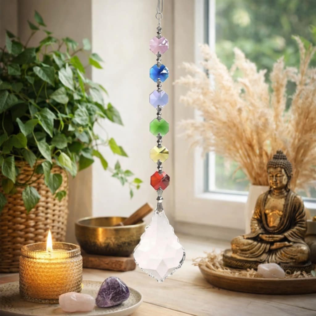 Objevte harmonii a krásu s čakrovým Feng shui lapačem sluneční energie s křišťálovým listem na konci, který symbolizuje „HARMONII SE VŠÍM, CO JE ŽIVÉ“., Tento jedinečný dekorativní kousek je vybaven sedmi osmihrannými krystaly, které symbolizují sedm čaker a je ideální pro všechny ,kdo hledají rovnováhu a pozitivní energii ve svém životním prostoru.