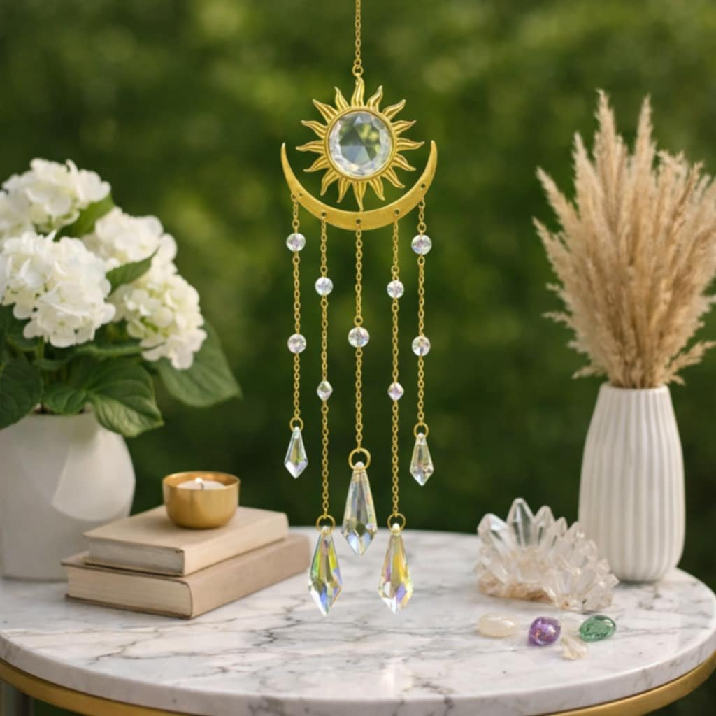 Přineste do svého domova světlo, klid a pozitivní energii s tímto unikátním lapačem energie Slunce a Měsíc. Vyrobený ze zlatého kovu elegantně zobrazuje slunce a měsíc, symboly harmonie a rovnováhy. Uprostřed září křišťálová skleněná kulička, která krásně zachycuje a odráží světlo a v interiéru vytváří třpytivý a atmosférický světelný efekt s jedinečnou atmosférou. Skvělý jako dekorace, osobní talisman, nebo výjimečný dárek.