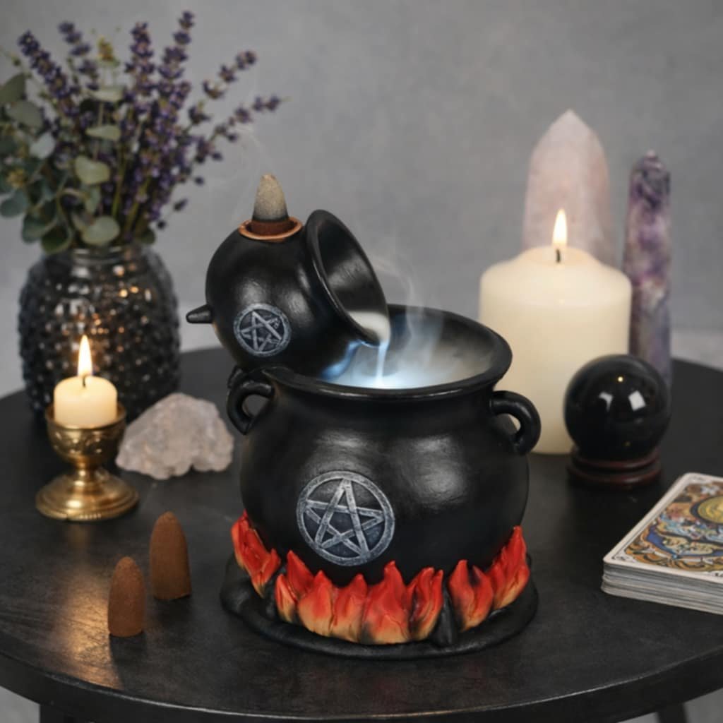 S fontánou z pryskyřice pro zpětné vonné kužely to nebude žádný problém. Dva magické kotlíky s pentagramem, který je jedním z nejsilnějších starodávných ochranných znamení působí jak vystřižené z čarodějnické dílny. Umístěte zapálený zpětný vonný kužel a sledujte, jak se kouř jemně rozlévá mezi kotlíky. Celkový efekt zdůrazňují plameny a světelné zakončení pro vytvoření výjimečného kouřového zážitku, který společně s Vaší oblíbenou vůní vytvoří tu správnou atmosféru s nezaměnitelným kouzlem.