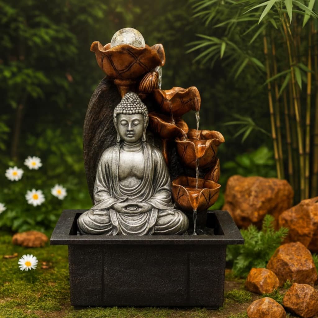 Stolní fontána stříbrný Buddha s křišťálovou koulí je víc než dekorace - je to symbol klidu, harmonie a nekonečné energie. Soška Buddhy vyzařuje duchovní sílu, zatímco voda stékající po jemných kaskádách navozuje uklidňující zvuk, který zklidní vaši mysl .Křišťálová koule vytváří okouzlující světelné efekty a přináší do prostoru pozitivní energii a magickou atmosféru.