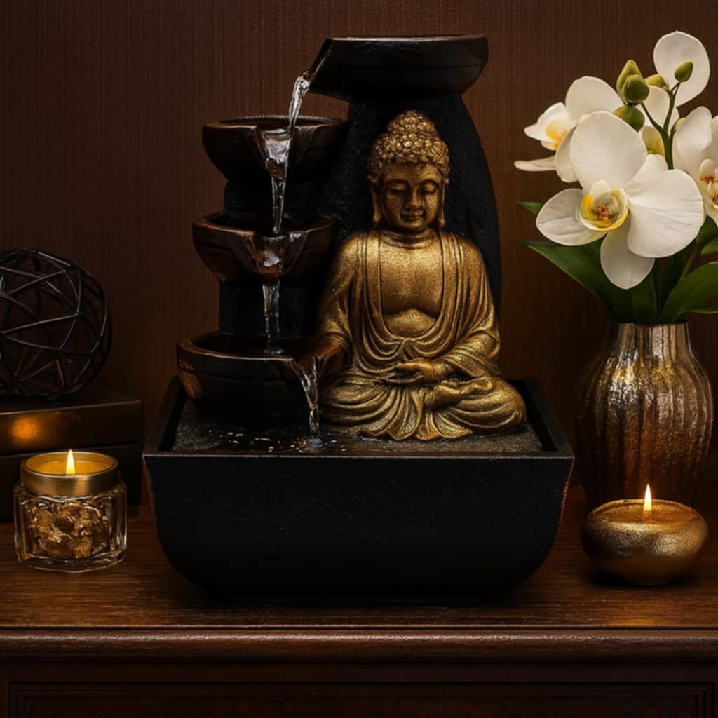 Zavedení feng-shui do vašeho domova vám může změnit život. Feng shui je o vytváření rovnováhy, harmonie, přirozeného toku energie pro zlepšení vaší nálady, pohody a vnitřní síly. Dekorativní stolní vodní fontána Buddha soucitu pro vnitřní použití, přináší do Vašeho domova nejen vizuální krásu, ale také stimuluje uklidňující zvuk tekoucí vody.