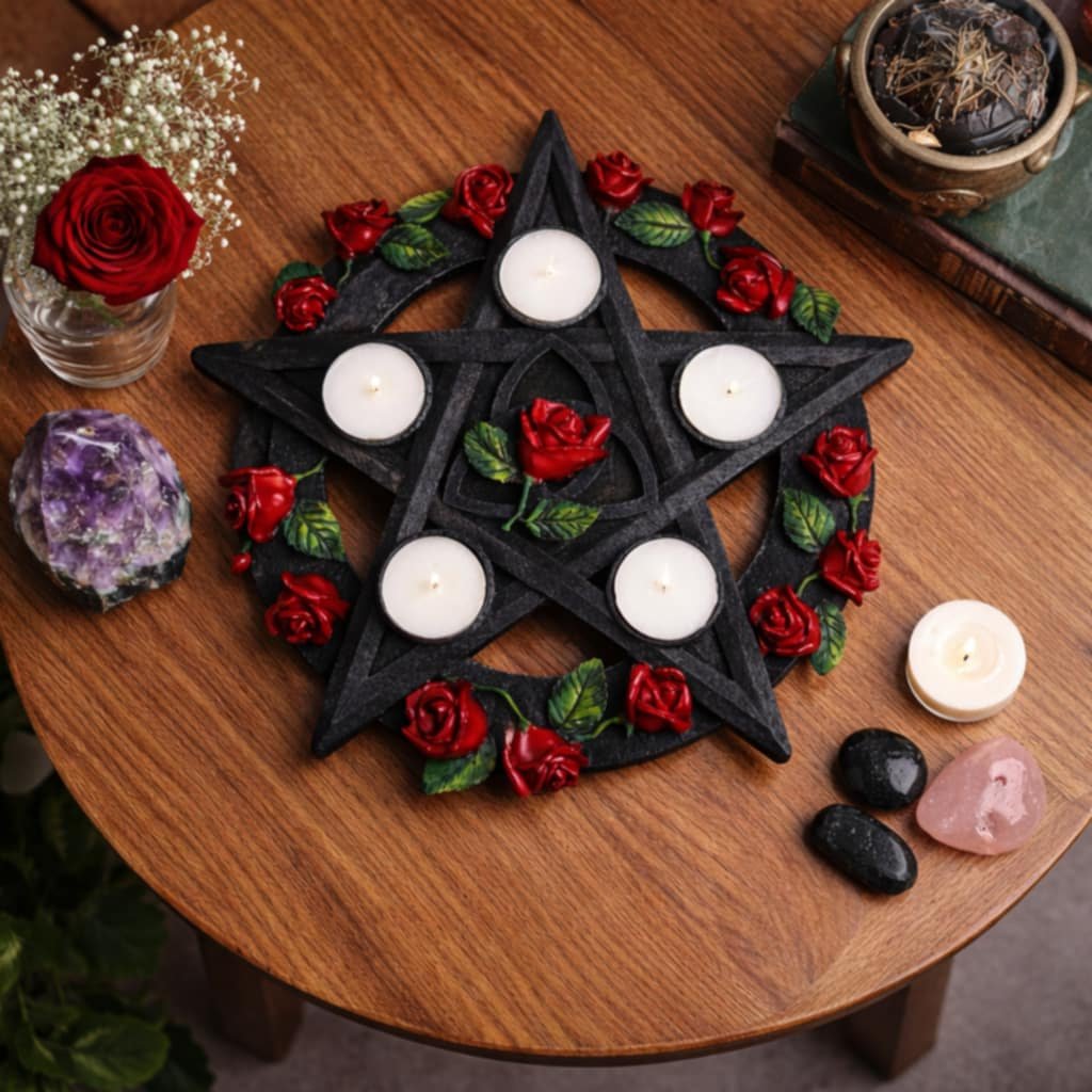 Objevte kouzlo gotického svícnu ve tvaru Pentagramu na čajovou svíčku, ručně malovaného z nejkvalitnější pryskyřice. Tento unikátní kousek je zdoben jasnými červenými růžemi a centrálním symbolem triquetra, který je hluboce duchovní, známý také jako trojitý uzel, který symbolizuje jednotu a posvátnou trojici - duchovní, duševní a fyzickou rovinu, zatímco pentagram symbolizuje rovnováhu mezi čtyřmi živly a duchovním aspektem života, Tímto dokonalým spojením přináší do vašeho prostoru harmonii a ochranu, zatímco jeho gotický design přidává nádech mystiky a elegance.