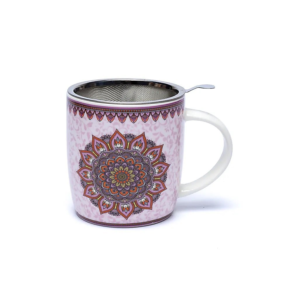 Nádherný porcelánový fialový hrnek na čaj s nerezovým sítkem Mandala v dárkové krabičce. Mandala je slovo ze sanskrtu, což znamená "kruh". Je to ornamentální vzor nebo obrázek, který se skládá z geometrických tvarů a vzorů radiálně uspořádaných kolem středu. Mandaly jsou často používány pro meditaci a hluboký symbolický význam v mnoha kulturách. Je ideální pro všechny milovníky duchovna a mystiky k pití horkých nápojů, jako je káva, čaj, nebo horká čokoláda. Jeho unikátní design, dodává každému pití zvláštní atmosféru a přidává mu kousek tajemna.