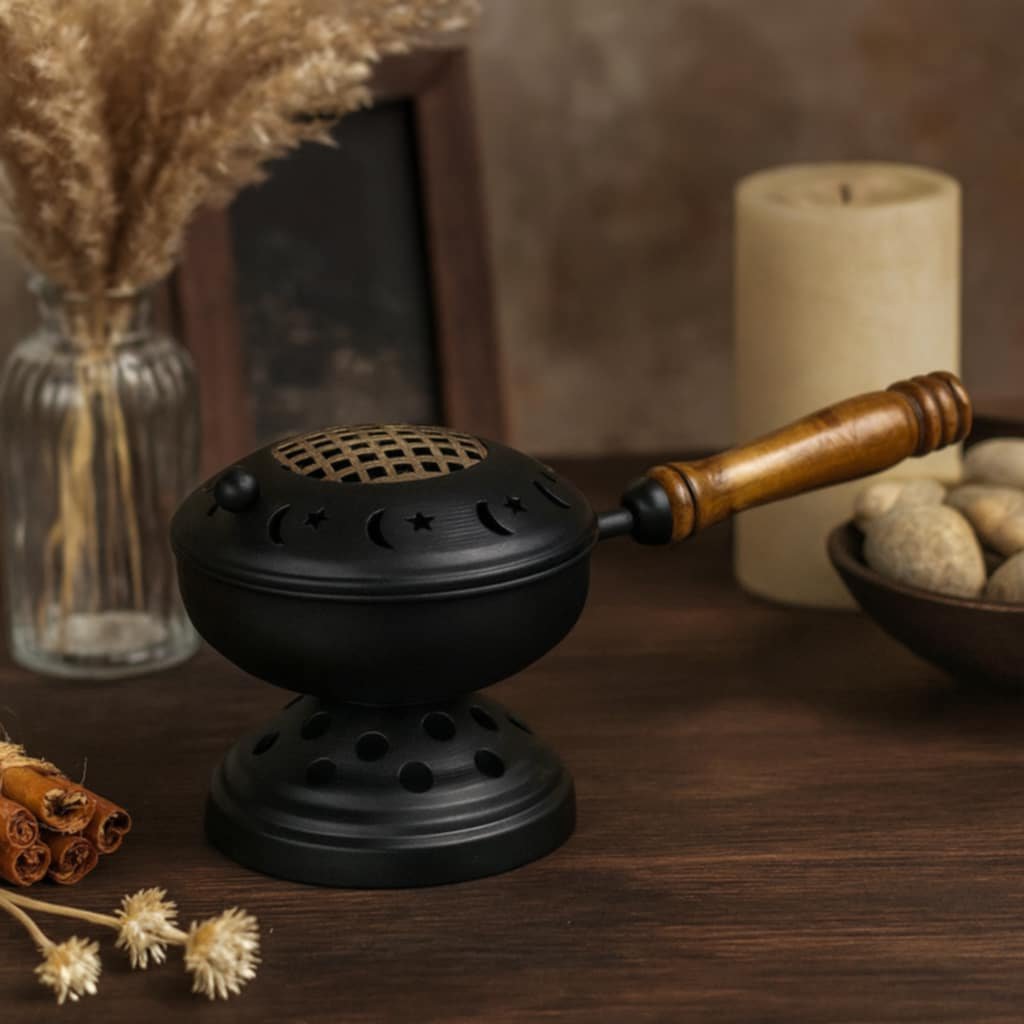 Velká železná kadidelnice na elegantním stojánku pro pálení pryskyřic i bylin okouzlí pevnou, ručně kovanou konstrukcí. Kolem jejího obvodu se vine detailní vyřezávání hvězd a měsíce, které po zapálení kadidla vytváří jemnou hru světla. Kadidelnice je vybavena dřevěnou rukojetí, pohodlnou a příjemnou na dotek, která jí dodává přírodní a tradiční charakter. Na samém vrchu ji zdobí jemný zlatý detail, jenž vytváří harmonický kontrast k tmavému kovu a činí z ní ideální doplněk pro rituály, meditaci i jako stylovou dekoraci.