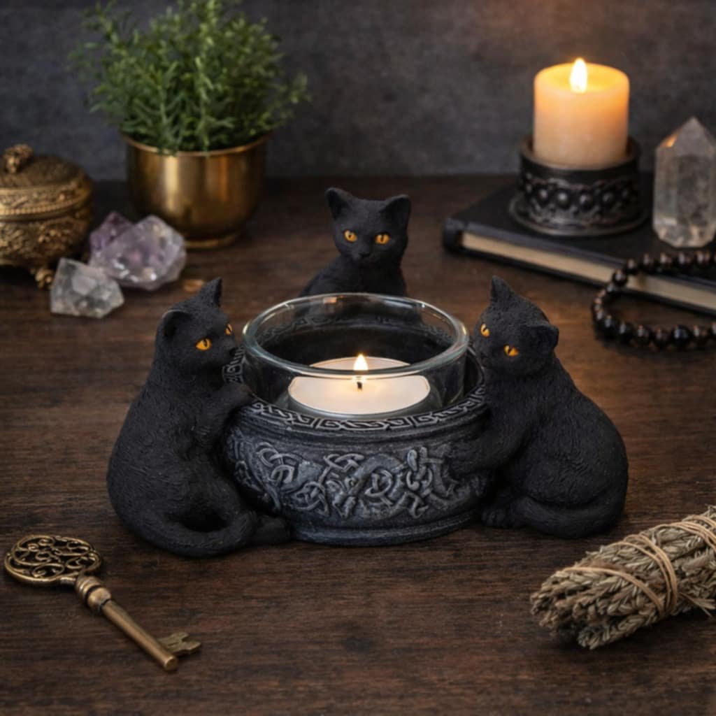 Tři černé magické kočky s pronikavýma žlutýma očima sedí kolem zdobeného svícnu a svými tlapkami chrání plamen čajové svíčky. Tento jedinečný kousek je vyroben z kvalitní pryskyřice a ručně malovaný s důrazem na detail. Přináší nejen kouzelnou atmosféru, ale i mystický nádech do vašeho domova. Skvělý dárek pro milovníky koček a tajemné elegance.