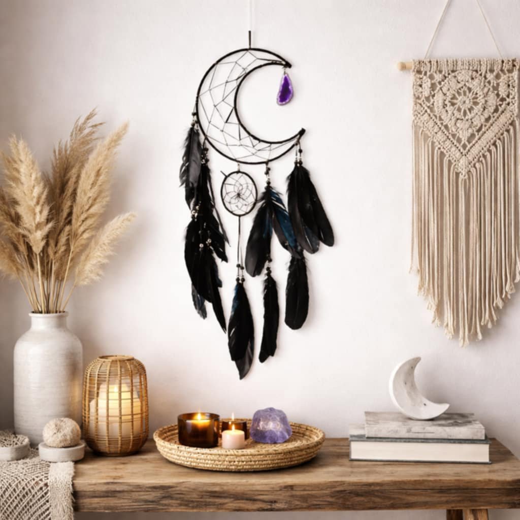 Dekorace: Lapač snů s achátem a černým půlměsícem může být umístěn jako dekorační prvek do vaší domácnosti, ložnice nebo místa, kde si přejete pocit ochrany a klidu.