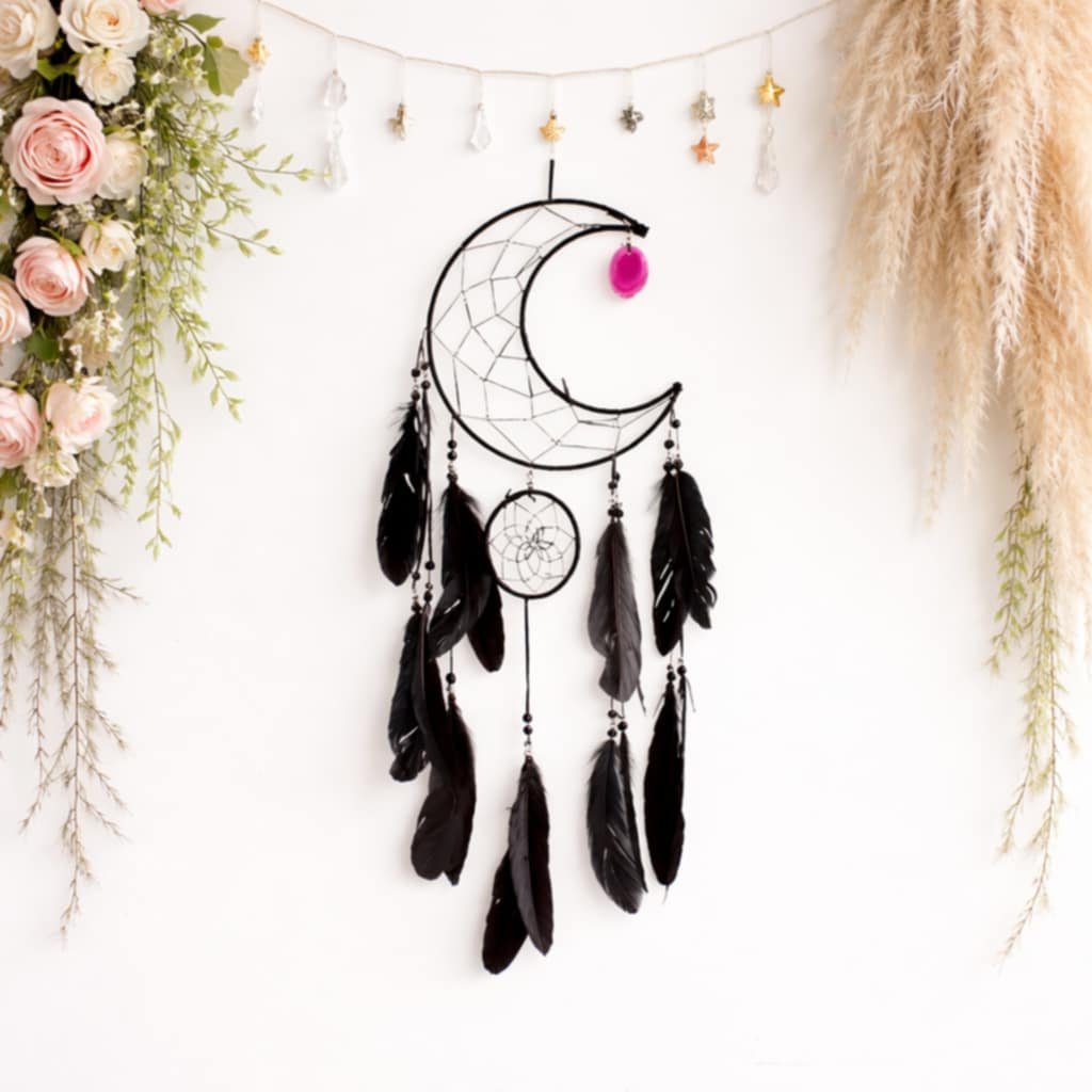 Dekorace: Lapač snů s achátem a černým půlměsícem může být umístěn jako dekorační prvek do vaší domácnosti, ložnice nebo místa, kde si přejete pocit ochrany a klidu.