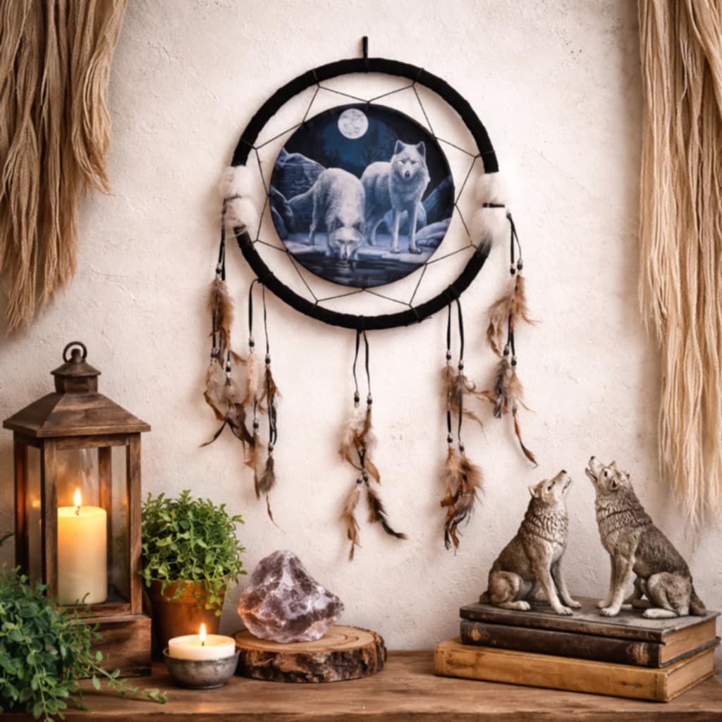 Vstupte do světa kouzel s nádherným lapačem snů 33cm - Vlci u jezera od renomované umělkyně Lisy Parker. Motiv vlků u jezera vyzařuje mystiku, sílu a propojení s přírodou. Vlk je symbol síly, odvahy, věrnosti a duchovní ochrany Precizní design v kombinaci s kvalitními materiály zaručuje nejen krásný vzhled, ale i ochranu před zlými sny. Ideální doplněk pro váš domov, nebo nádherný dárek pro vaše blízké.