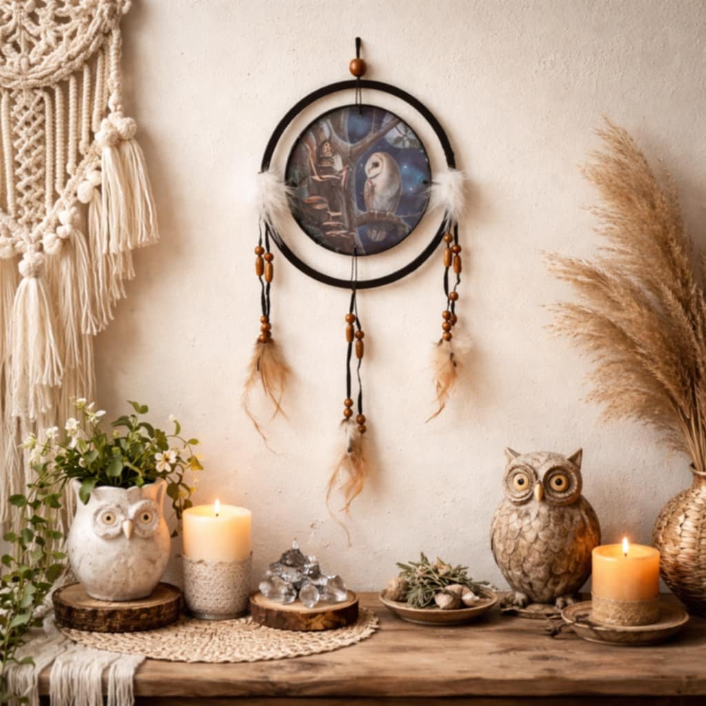 Nádherný vílí lapač snů večerní rozmluva víly s moudrou sovou ochrání Váš nerušený spánek a stane se ozdobou každého interiéru. Design vytvořila umělkyně Lisa Parker.