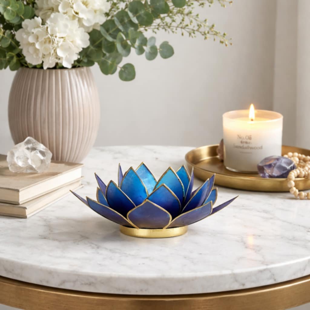 Překrásný Lotosový svícen na čajovou svíčku modré barvy se zlatým lemováním okrajů listů je vyrobený z Filipínských mušlí ve tvaru lotosu. Lotos symbolizuje transformaci z temnoty do světla, z nevědomosti do moudrosti. Rozkvetlý lotos je symbolem čistoty, skromnosti, laskavosti a dokonalosti. Představuje lásku, plodnost, moudrost.