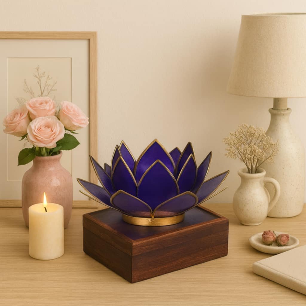 Překrásný Lotosový svícen na čajovou svíčku fialové barvy se zlatým lemováním okrajů listů je vyrobený z Filipínských mušlí ve tvaru lotosu. Lotos symbolizuje transformaci z temnoty do světla, z nevědomosti do moudrosti. Rozkvetlý lotos je symbolem čistoty, skromnosti, laskavosti a dokonalosti. Představuje lásku, plodnost, moudrost.