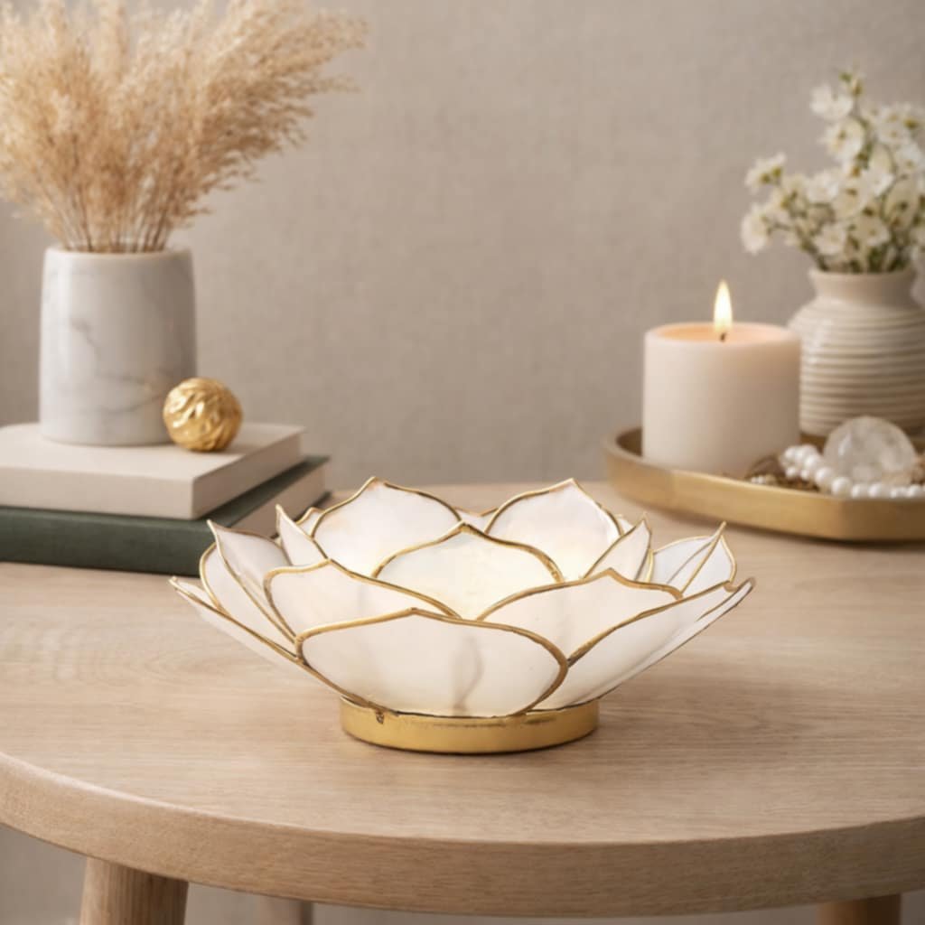 Překrásný Lotosový svícen na čajovou svíčku přírodní barvy se zlatým lemováním okrajů listů je vyrobený z Filipínských mušlí ve tvaru lotosu. Lotos symbolizuje transformaci z temnoty do světla, z nevědomosti do moudrosti. Rozkvetlý lotos je symbolem čistoty, skromnosti, laskavosti a dokonalosti. Představuje lásku, plodnost, moudrost.
