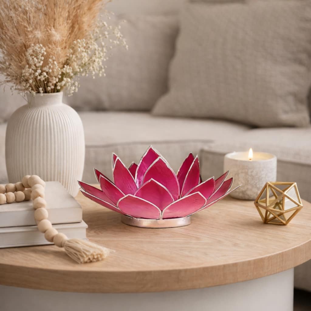 Překrásný Lotosový svícen na čajovou svíčku světle růžové barvy se stříbrným lemováním okrajů listů je vyrobený z Filipínských mušlí ve tvaru lotosu. Lotos symbolizuje transformaci z temnoty do světla, z nevědomosti do moudrosti. Rozkvetlý lotos je symbolem čistoty, skromnosti, laskavosti a dokonalosti. Představuje lásku, plodnost, moudrost.
