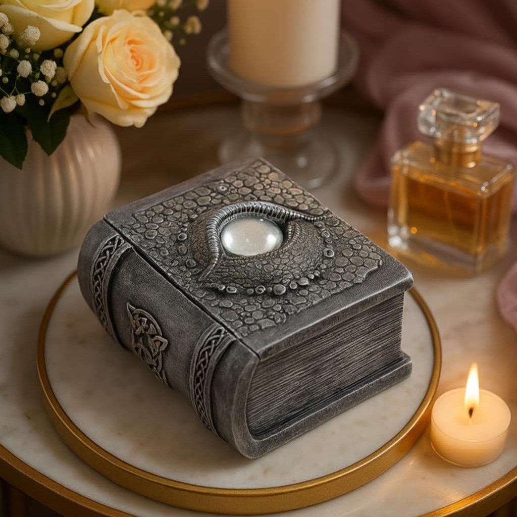 Luxusní pryskyřičná krabička, nebo šperkovnice ve tvaru knihy s texturou vyvýšené dračí kůže a okouzlujícím barevným dračím okem uprostřed. Tento poutavý styl je ideální pro bezpečné uchování malých balíčků tarotových karet, krystalů, bylin, kyvadel a dalších malých předmětů. pro bezpečné uchování.