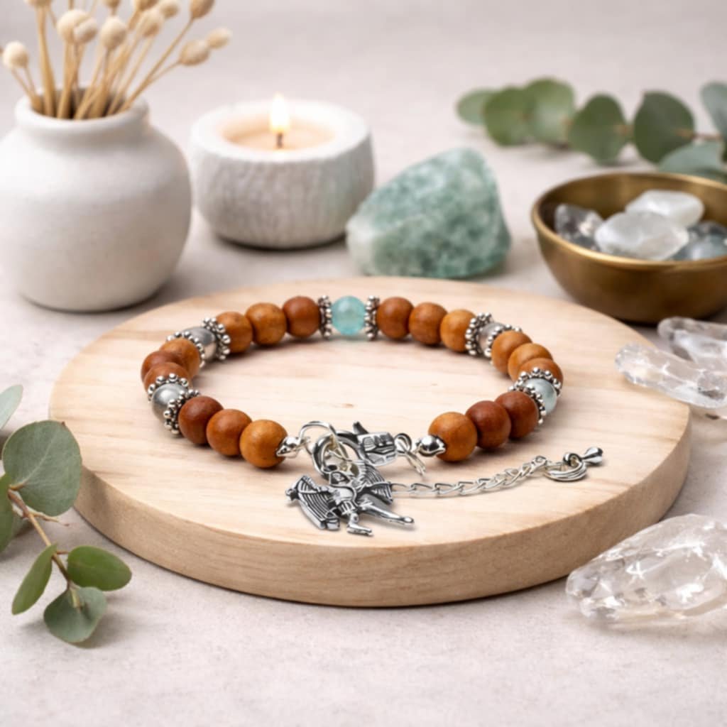 Elastický minerální náramek z akvamarínu a dřevěných kuliček s přívěskem Archanděl Michael se rázem stane Váš nejoblíbenější klenot, který Vás bude doprovázet na každém kroku. Zároveň Vás mile překvapí svými přínosnými účinky na tělo i mysl mezi které patří: