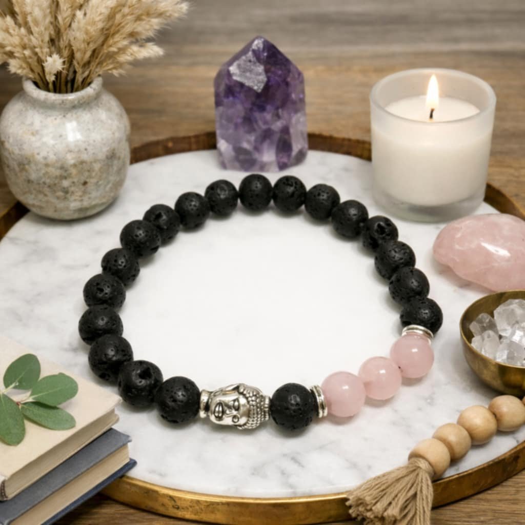 Tento úžasný Lávový náramek s růženínem a stříbrným buddhou se hodí k jakémukoliv outfitu. A nejen to, oba má i jiné benefity.