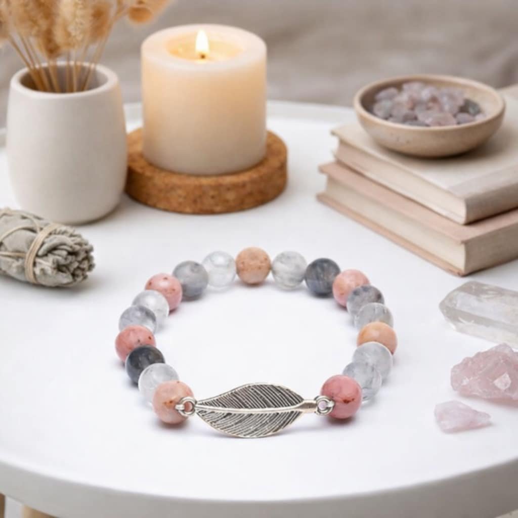 Elastický minerální náramek z Rodonitu a Šedý křemen s přívěskem Pírka se rázem stane Váš nejoblíbenější klenot, který Vás bude doprovázet na každém kroku. Zároveň Vás mile překvapí svými přínosnými účinky na tělo i mysl mezi které patří: