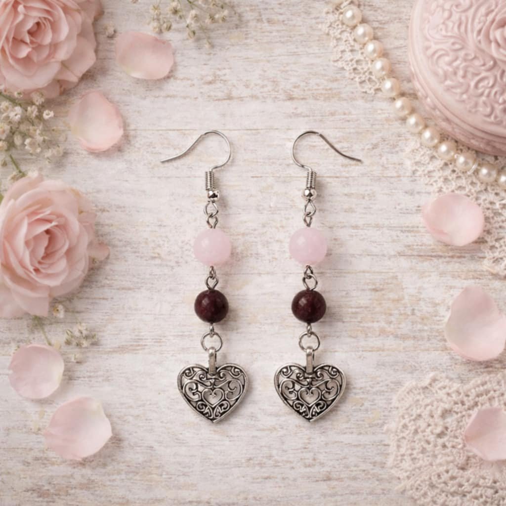 Objevte kouzlo ručně vyráběných náušnic s růženínem a granátem zdobené jemným přívěskem ve tvaru srdce, které jsou dokonalým symbolem něhy a ženskosti.