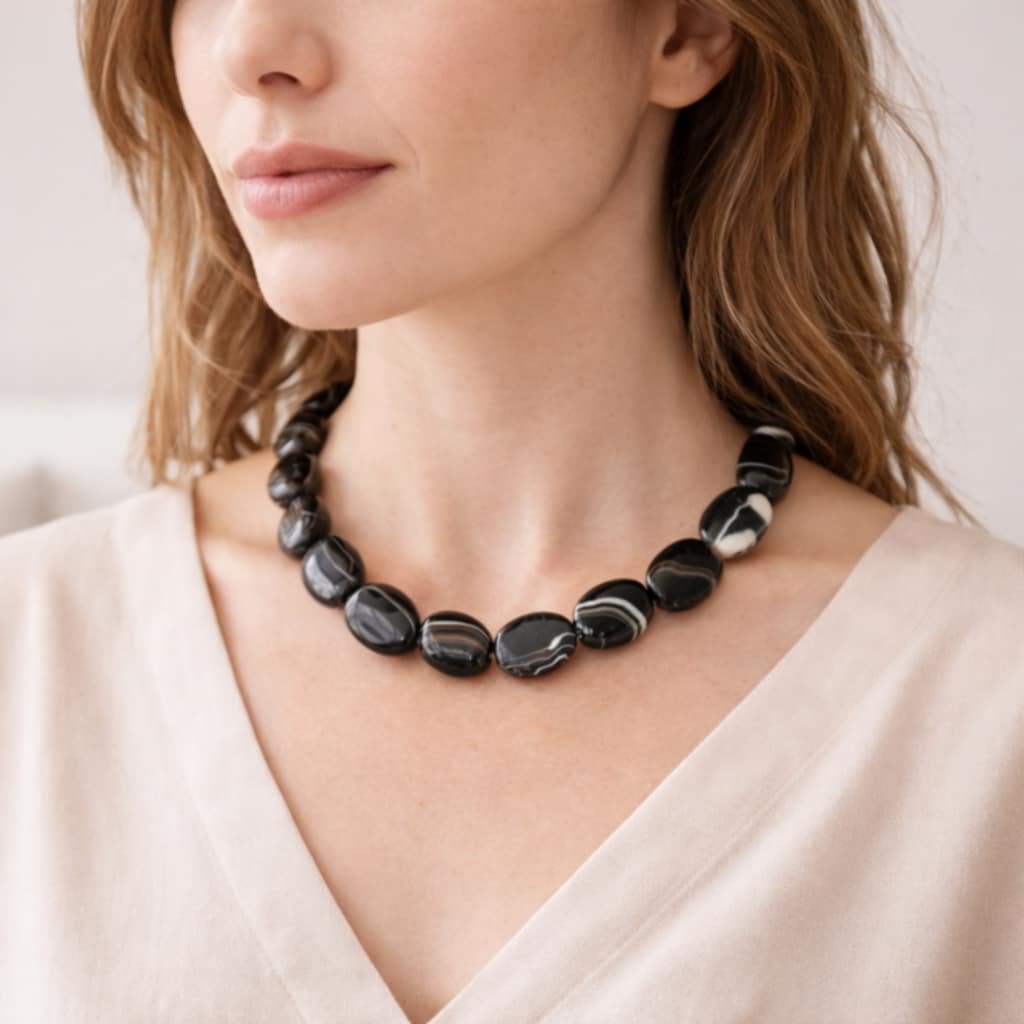 Náhrdelník Onyx" je exkluzivní šperk, mystickým kamenem s vysokými spirituálními vibracemi a silnou očistnou a léčivou mocí, Náhrdelník má jemný a elegantní design, který zvýrazňuje krásu onyxu a jeho lesk.