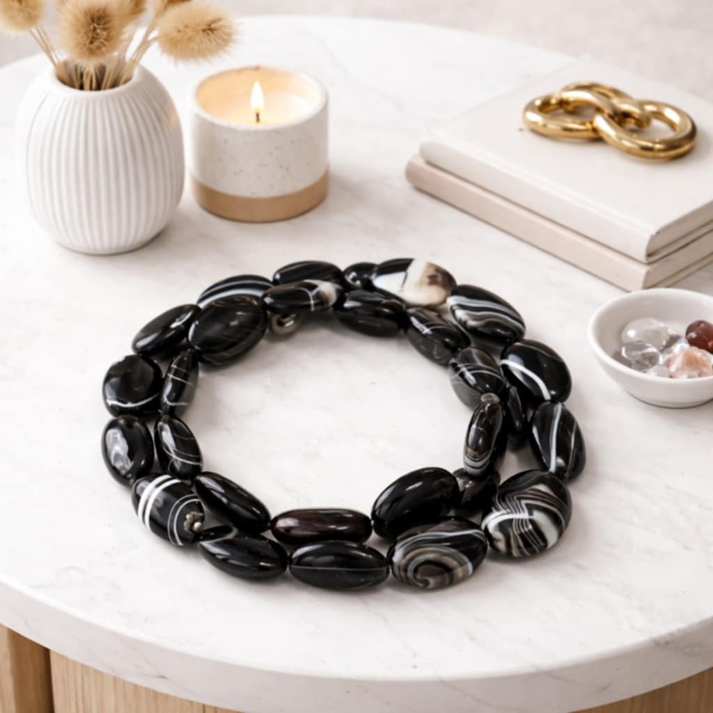 Vlastnosti :Tajemný Onyx dodává sílu a energii je ochranným kamenem, který brání a ochraňuje před negativitou. Zvyšuje sebedůvěru a sebekontrolu, snižuje strach a obavy. Blahodárně působí na zuby, kosti a problémy nohou.