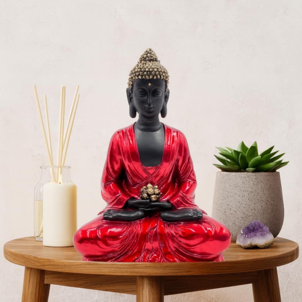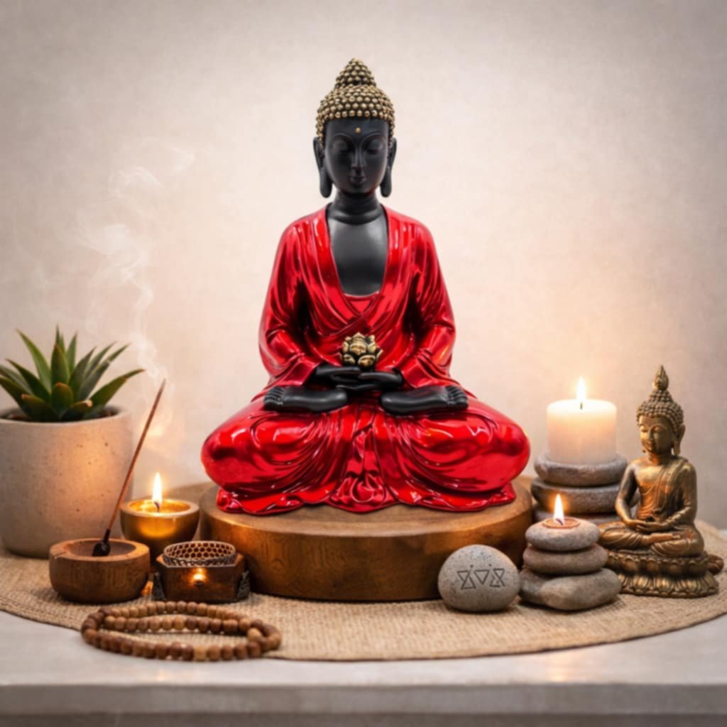 Velká Soška Buddhy červeno zlatá promění každý prostor v oázu harmonie. Je vyrobena z kvalitní pryskyřice, která zaručuje dlouhou životnost. Buddha je symbol moudrosti, štěstí, vyrovnanosti, osvícení a pozitivní energie. Pozice obě ruce v klíně Buddhy symbolizuje hlubokou meditaci vedoucí k osvícení.