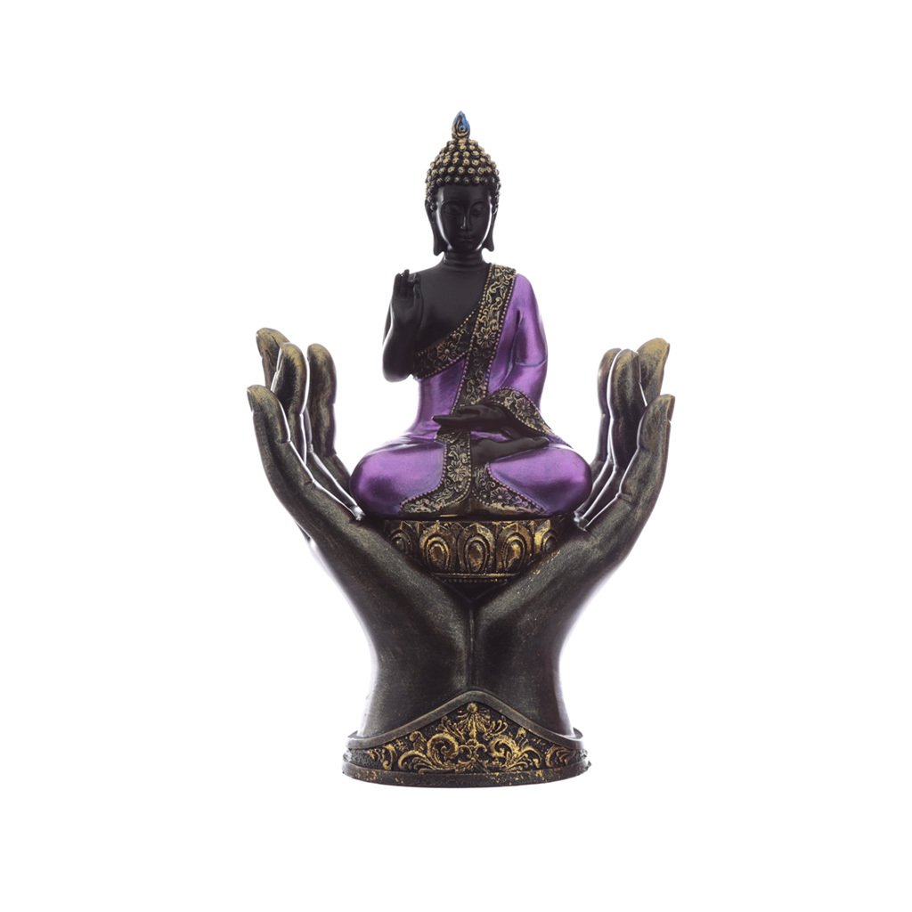 Krásná soška černofialový Buddha sedící v dlaních se zdviženou rukou v nádherném zdobeném rouchu. Ochranný Buddha je obvykle znázorňovaný se zdviženou pravicí před hrudníkem a levou dlaní položenou v klíně. Ochranný Buddha symbolizuje odvahu a nabízí božskou ochranu před hněvem, strachem a klamem. Tato soška je vyrobena s důrazem na detail a působí jako elegantní doplněk interiéru i jako duchovní talisman pro harmonii a vnitřní mír.