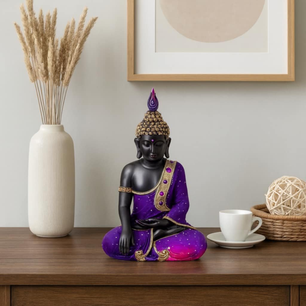 Velká Soška Thai Buddha Meditace v černo fialovém provedení s hvězdnými detaily promění každý prostor v oázu harmonie. Je vyrobena z kvalitní pryskyřice, která zaručuje dlouhou životnost. Buddha je symbol moudrosti, štěstí, vyrovnanosti, osvícení a pozitivní energie