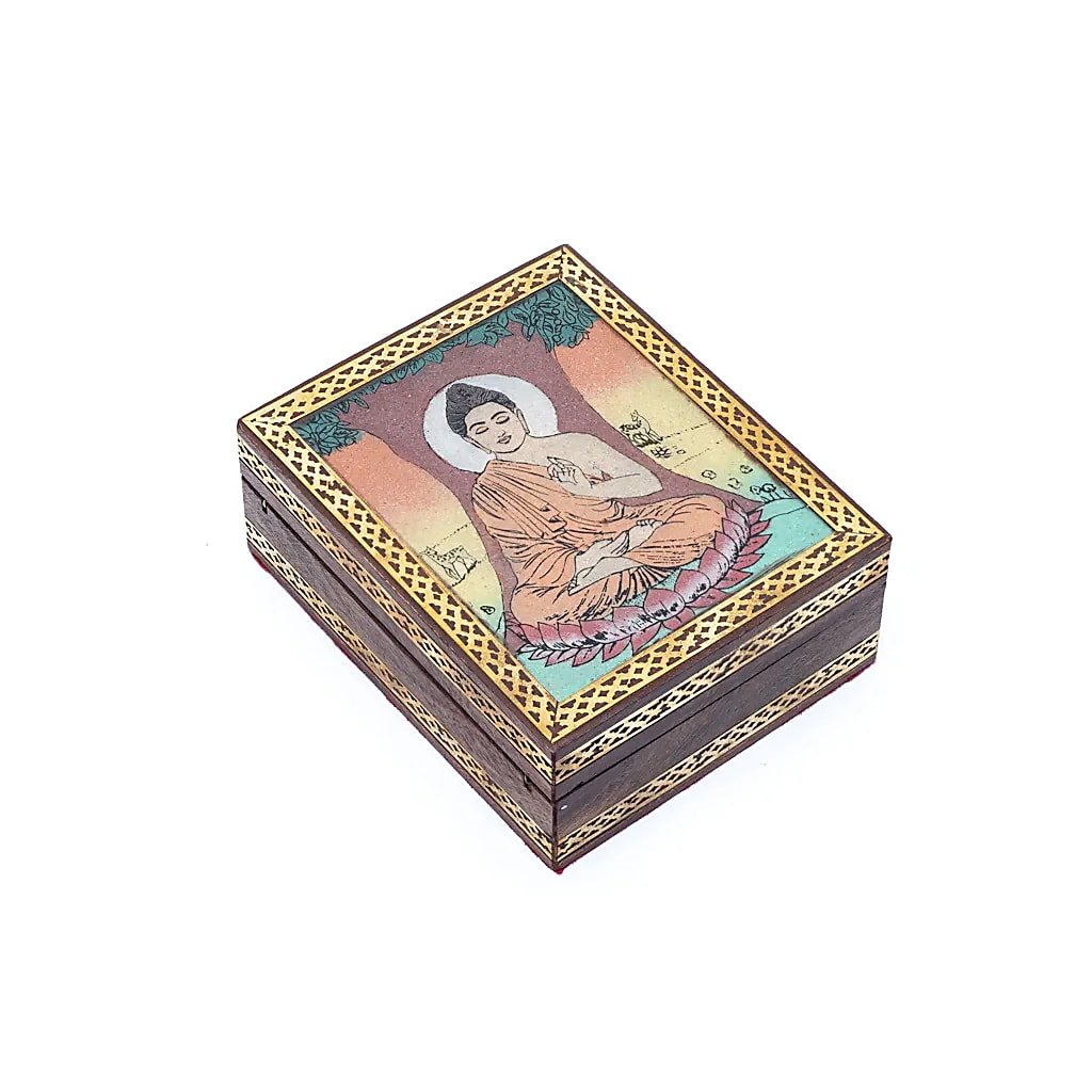 Nádherná krabička, nebo šperkovnice s Buddhou je vyrobená z mangového dřeva , které je známé svojí trvanlivostí a krásnou texturou. Krabička je vyložena jemnou sametovou podšívkou, která dodává na eleganci a chrání obsah. Šperkovnice je precizně zdobena kresbou Buddhy pod stromem Bódhi .Buddha zde zaujímá učící mudru- gesto moudrosti, poznání a předávání pravdy,