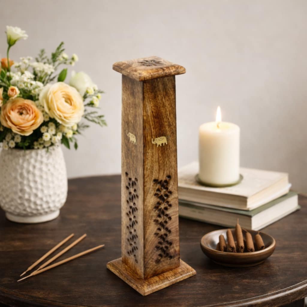 Stojan věž na vonné tyčinky a kužely je zdoben řezbou a mosaznou intarzií v podobě slona. S mistrovským citem ručně vyráběný Stojan z mangového dřeva je dovezený z Indie. Po rozpálení tyčinky či kuželu přiklopte krytem. Vonný dým bude proudit skrze otvory ve stojánku.