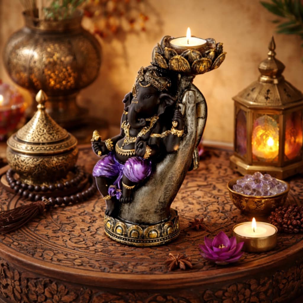 Originální černý stojánek zdobený zlatými a fialovými prvky hinduistického boha Canesha, který vytvoří ve Vašem domově okouzlující atmosféru orientu.