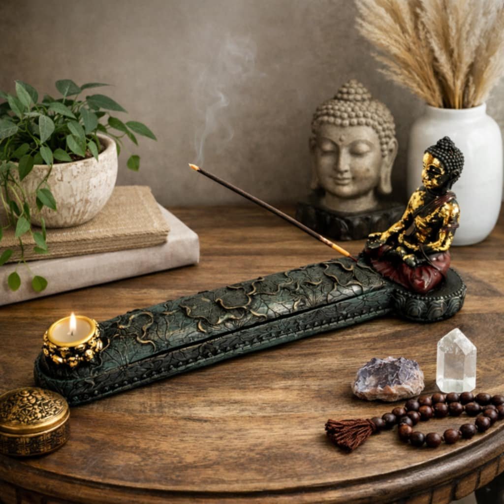 Orientální stojánek na vonné tyčinky a kužely s motivem Buddhy s nádherným zdobením. Stojánek s víčkem je sám o sobě velice dekorativní a po sejmutí krytu stojánku pak poslouží k praktickému vykuřování vonných tyčinek a kuželů Samotný rituál vykuřování umocní Buddha připevněný na stojánku, který přináší spokojenost a úspěch ve všech oblastech života.