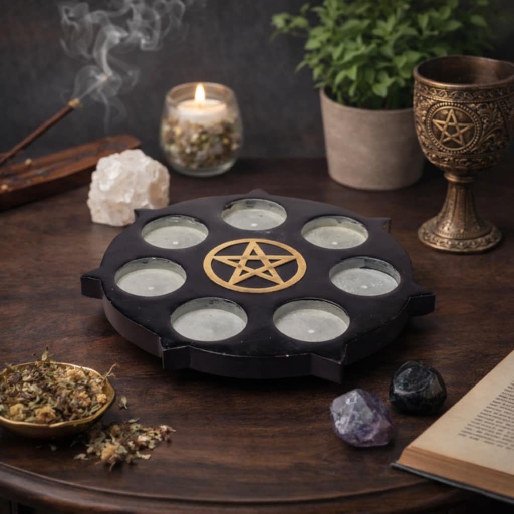 Objevte kouzlo magického kruhového svícnu Pentagram na čajovou svíčku z mastku. Tento unikátní kousek je je stylovým doplňkem pro vaše duchovní rituály či meditace, Pentagram symbol rovnováhy a ochrany dodává svícnu mystickou energii a zároveň vytváří krásný estetický zážitek.
