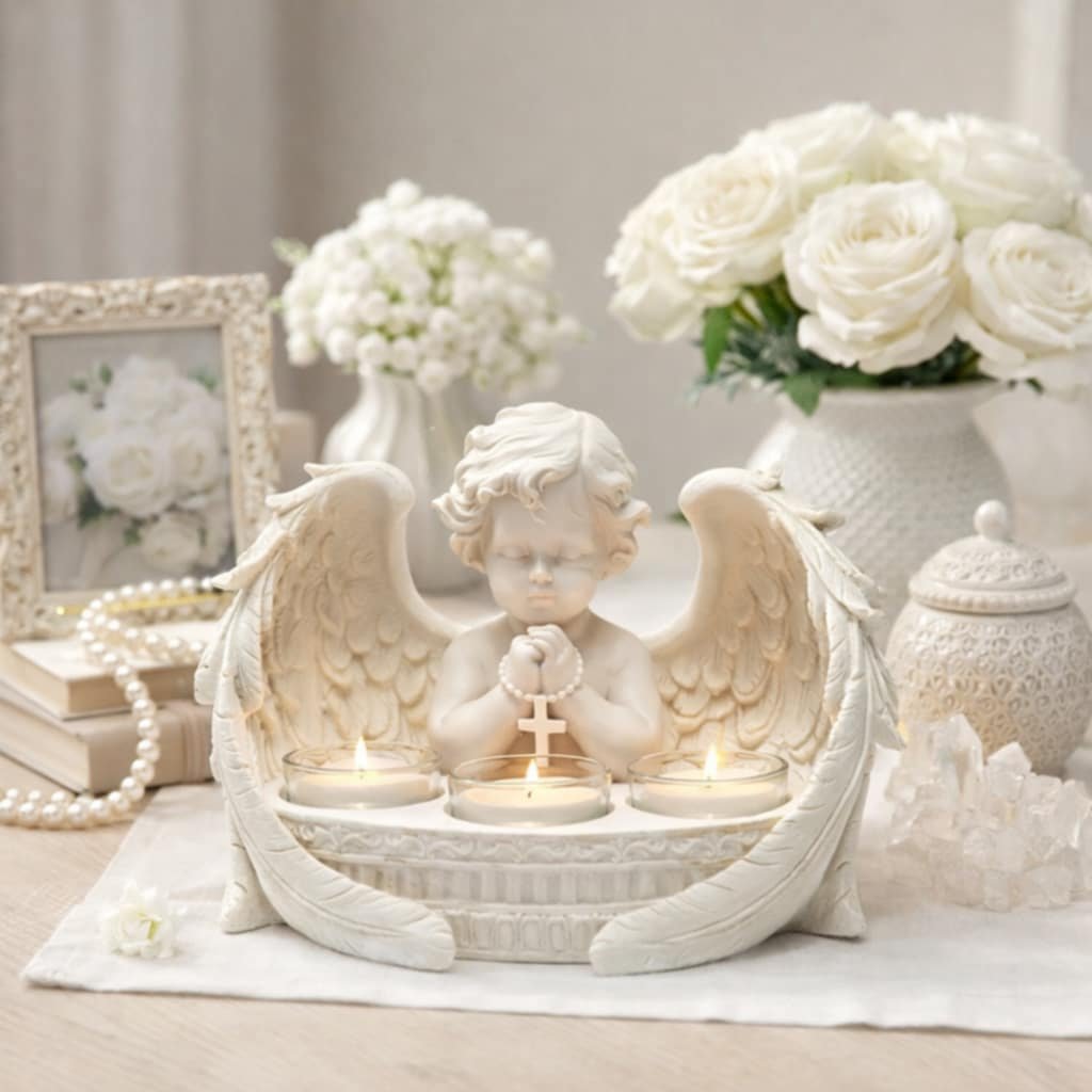 Svícen modlící se cherubín symbolizující ochranu, čistotu a božskou pomoc je vyrobený z nejkvalitnější pryskyřice a navržený pro tři čajové svíčky, dodá každému prostoru andělský nádech. Pečlivě propracované detaily a jemný vzhled cherubína se svícemi vytvoří kouzelnou atmosféru v obývacím pokoji, ložnici, nebo na slavnostní tabuli