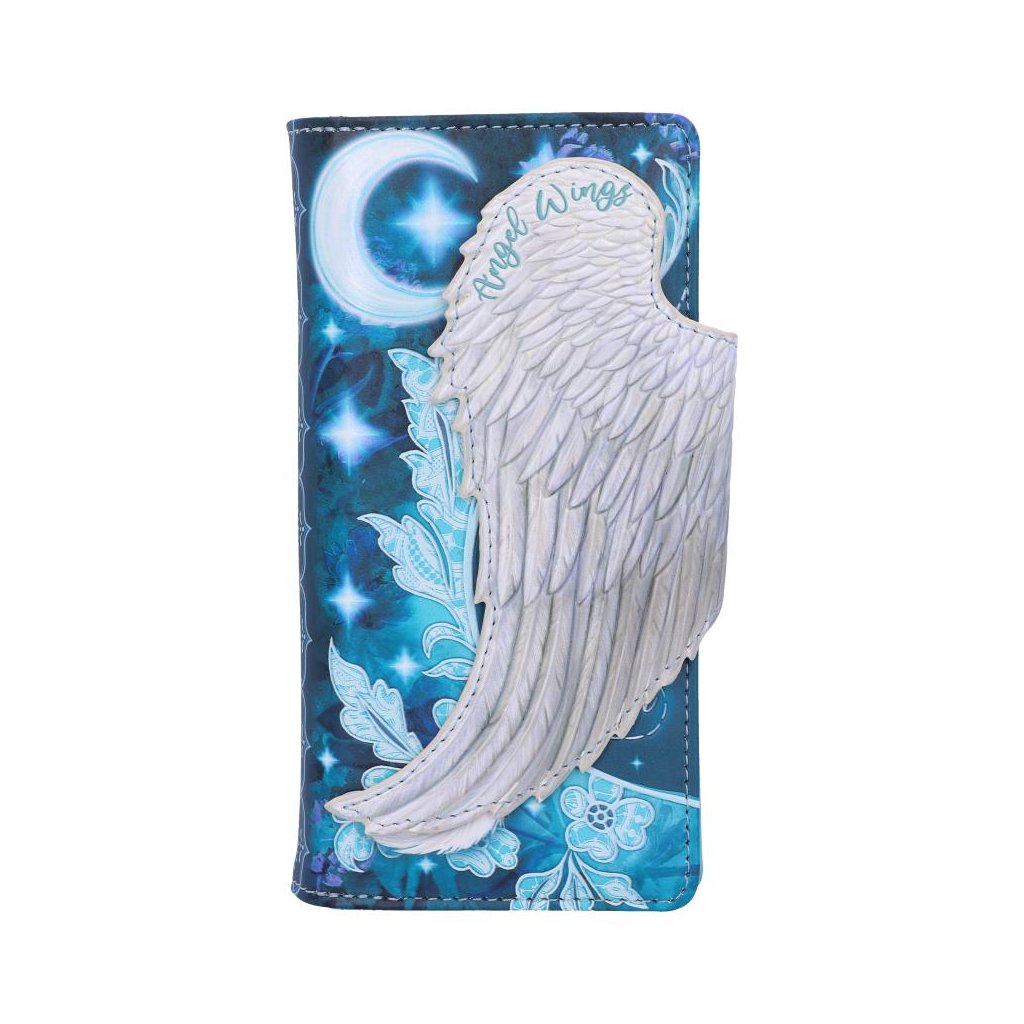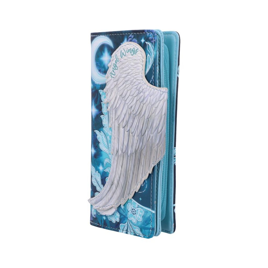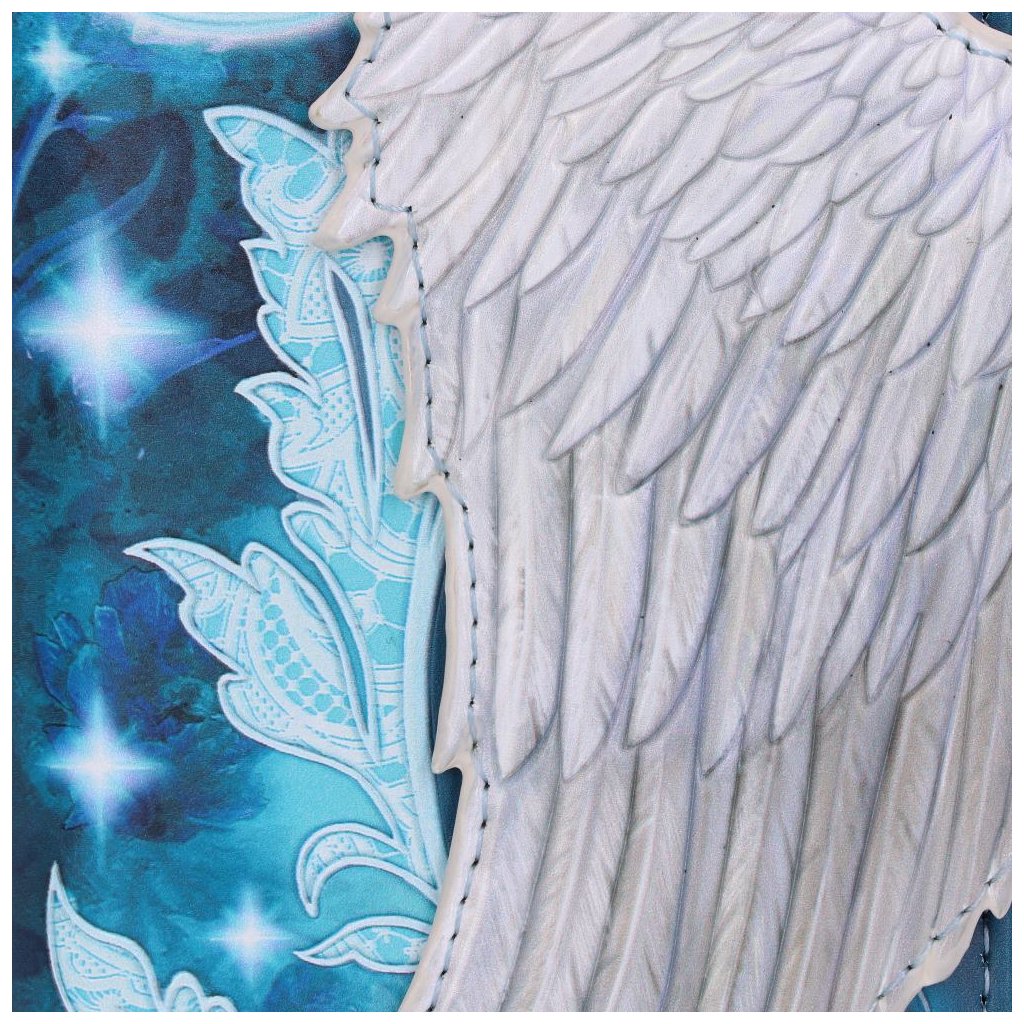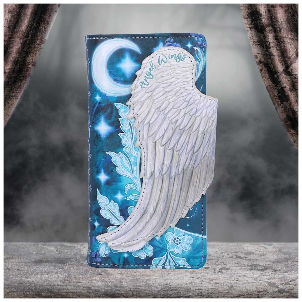 Magická prostorná peněženka Andělská křídla z velice kvalitního materiálu. Nádherné embosované detaily umocňují kouzlo a vytvářejí výrazný 3D efekt, zatímco velké i malé přihrádky pro mince, bankovky, doklady a karty s magnetickým zapínáním peněženky z ní dělají úžasně praktický kousek. Na přední straně této peněženky je velké bílé, opeřené andělské křídlo, které tvoří zajišťovací klopu. Po otevření odhalí skryté poselství „Když se objeví peříčka, andělé jsou blízko“, obklopený složitými květinovými vzory.