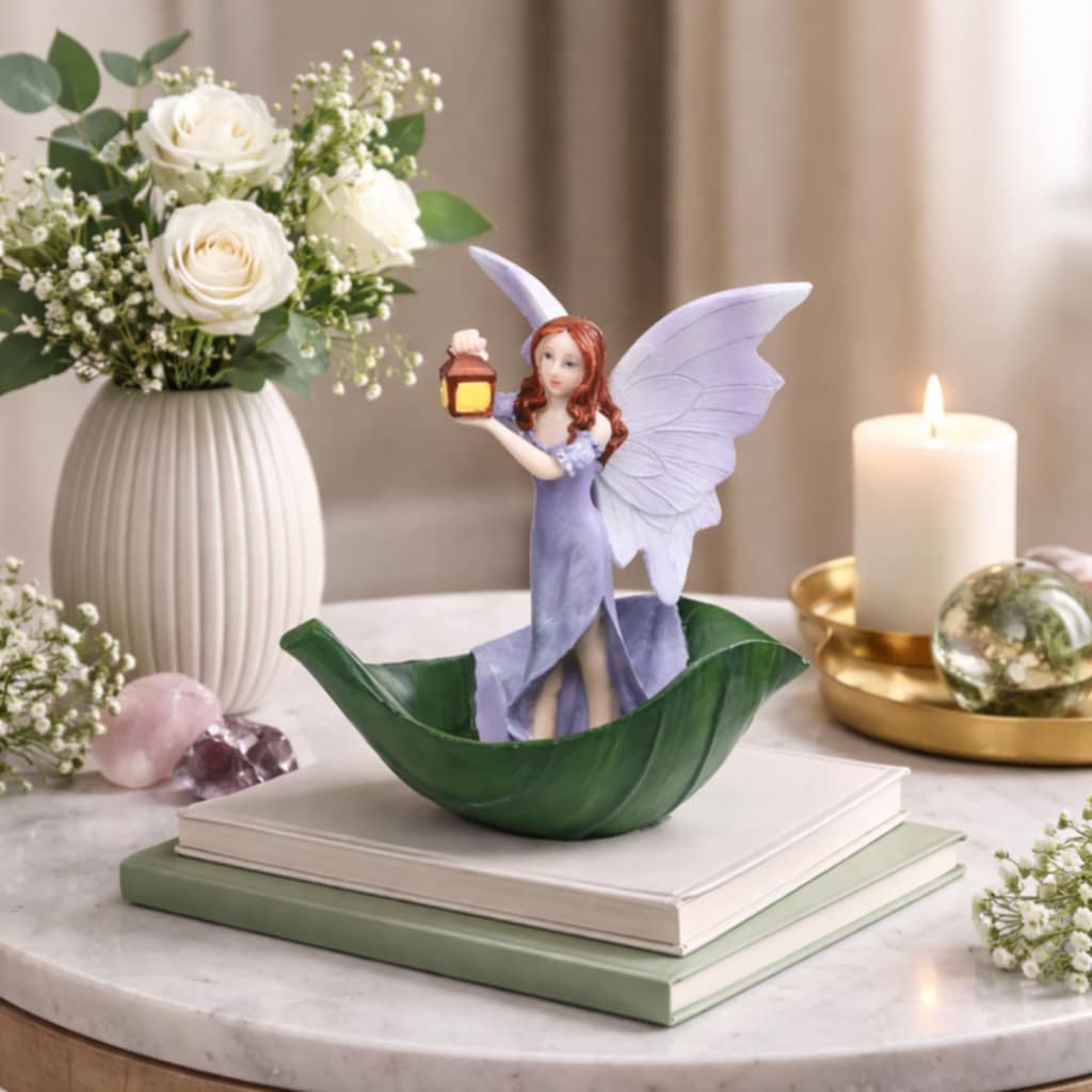 Z vílího světa k nám připlouvá šeříková víla na své listové loďce s lucerničkou a svítí na cestu všem ,kteří zabloudili ve tmě. Krásná vílí dekorace vytvoří v každém interiéru nádhernou mystickou atmosféru. Krásný dárek pro všechny milovníky světa Fantasy.