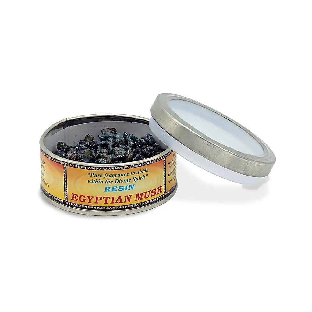 Neodolatelná pryskyřice Egyptské pižmo v plechové krabičce kadidlová pryskyřice s esenciálním pižmovým olejem. Egyptské pižmo je mystická, květinová vůně, která přináší harmonii, uvolnění, zklidnění mysli. Smyslný kouř pižma má afrodiziakální účinky.