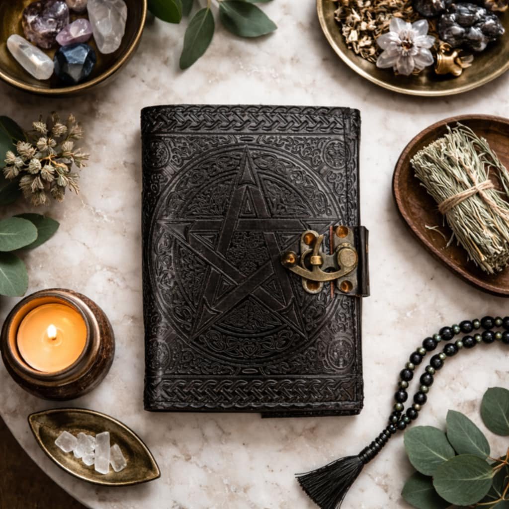 Kožený zápisník, diář nebo knížka na malování? Bude vše co si budete přát dle Vaší libosti. Ať už se používá k zapisování rychlých poznámek a náčrtů nebo k vytváření osobní knihy kouzel, tento kožený deník je ideální pro čarodějnice i milovníky fantasy. Reliéfní kožený obal a rustikální papírové stránky vytvářejí opotřebovaný, okouzlující kousek, který se bude předávat a užívat po generace. Obsahuje detailní pentagramový design s mosazným kovovým uzávěrem. Ručně vyrobené v Indii z pravé kůže a nelinkovaných papírových stránek.